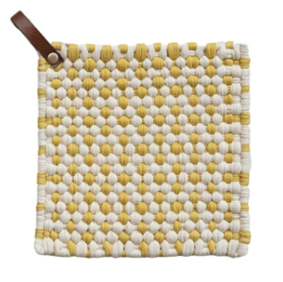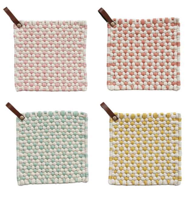 Details : 8" Square Cotton Crocheted Pot Holder w/ Leather Loop, Multi Color, 4 Colors