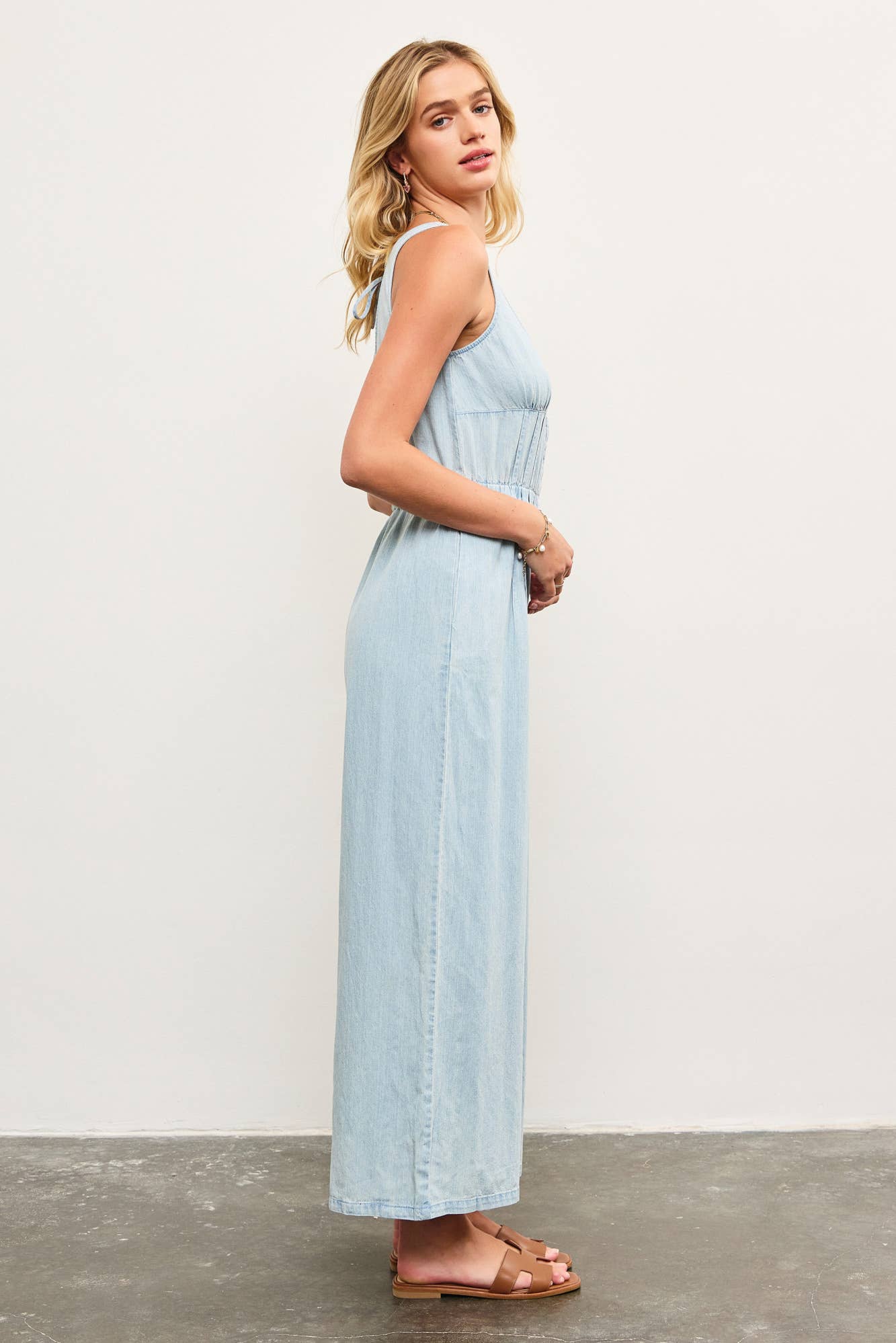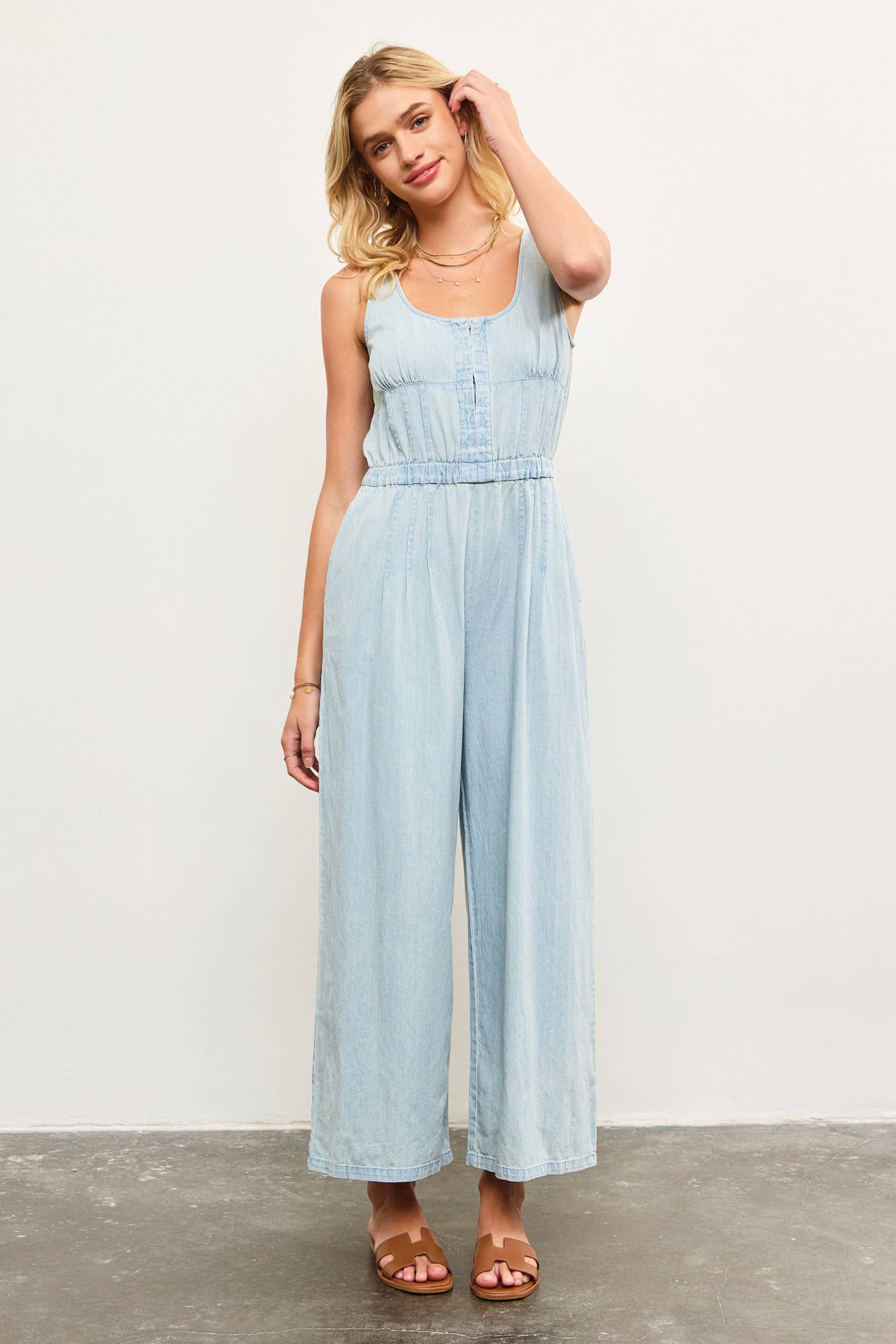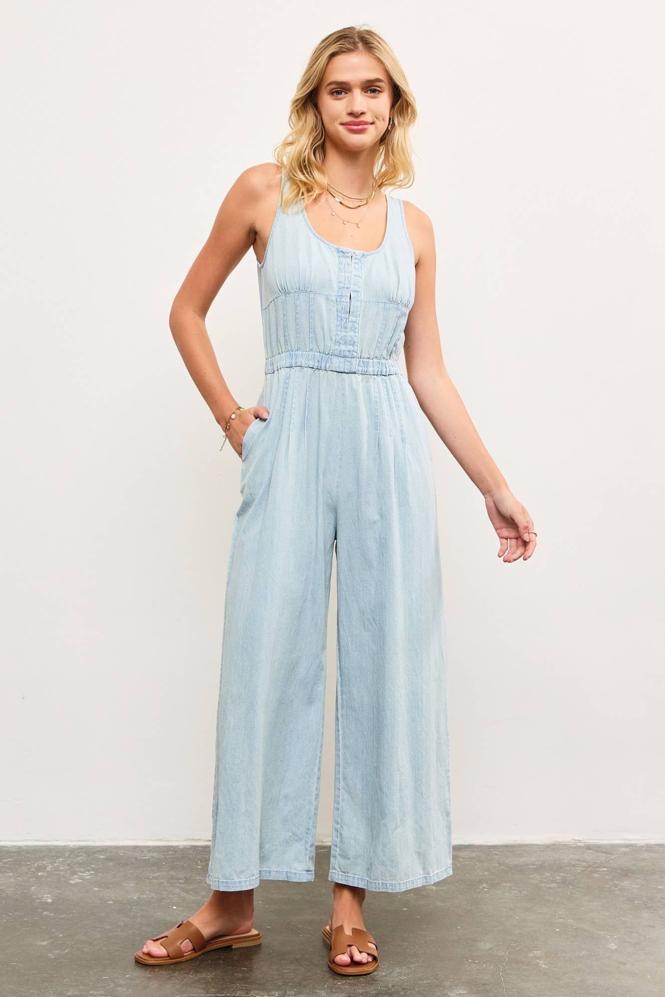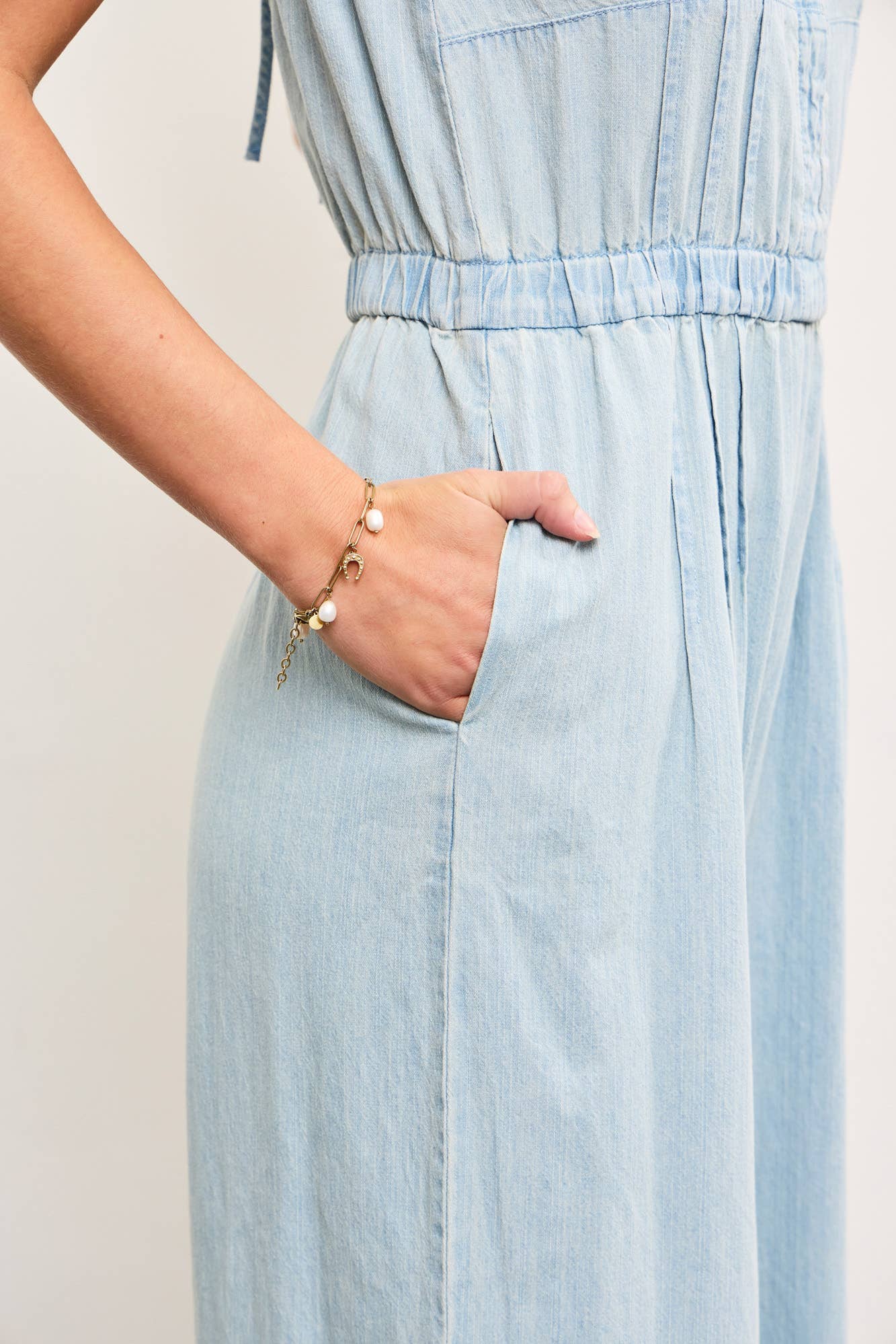A front hook and eye closure pintuck detail tied back denim jumpsuit is a stylish and functional piece of clothing that combines modern design elements with classic denim fabric.
