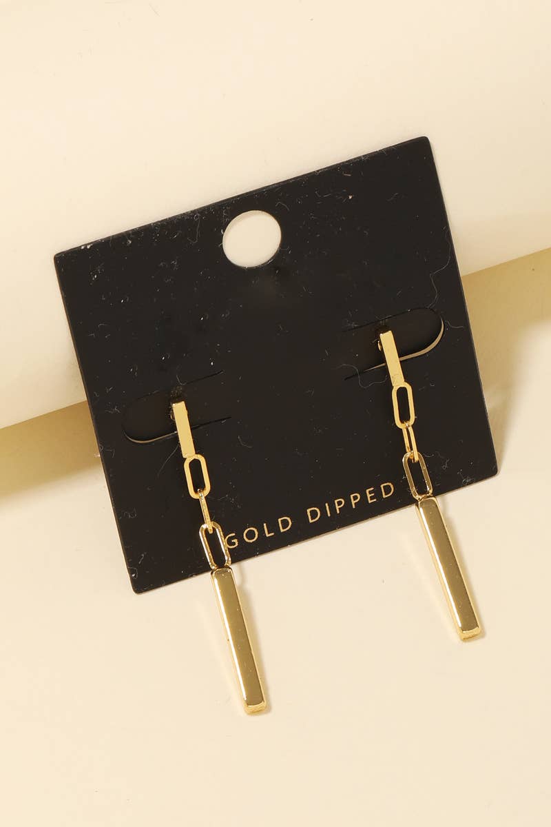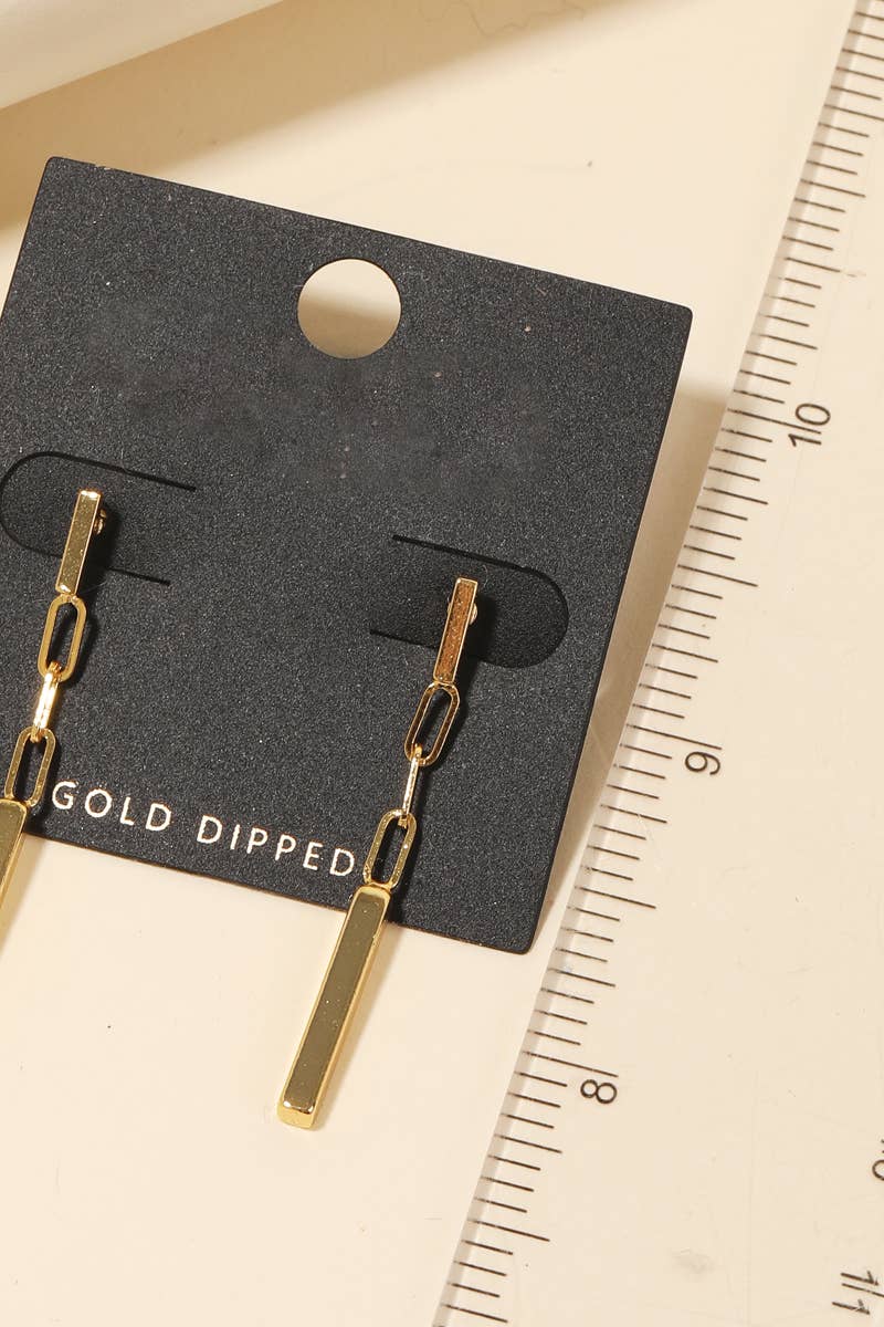 This season's must-have accessory, this pair of dangle earrings highlights a special gold dipped bar chain dangle earrings design. This accessory is the perfect finishing touch to any outfit, adding a touch of sophistication and glamour.