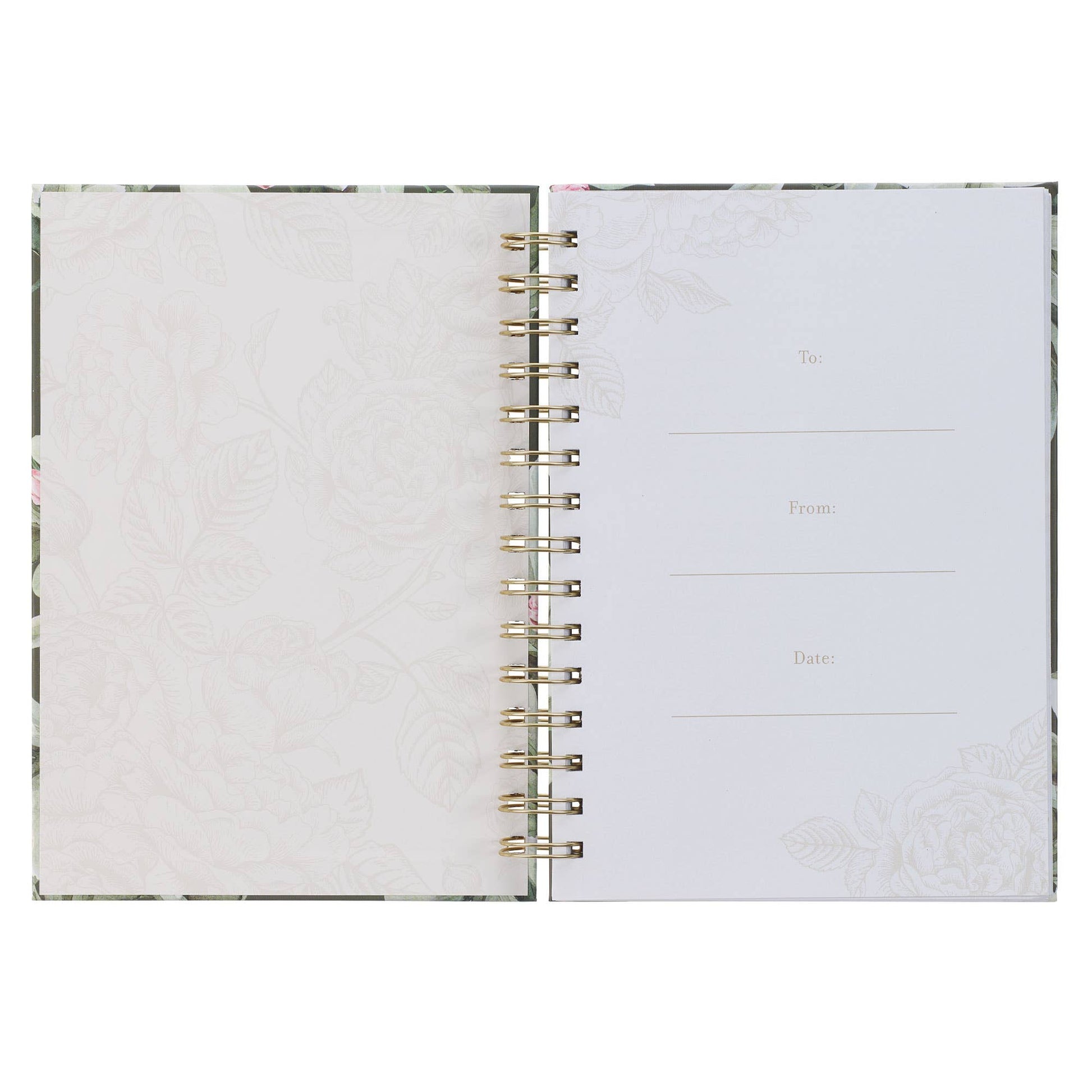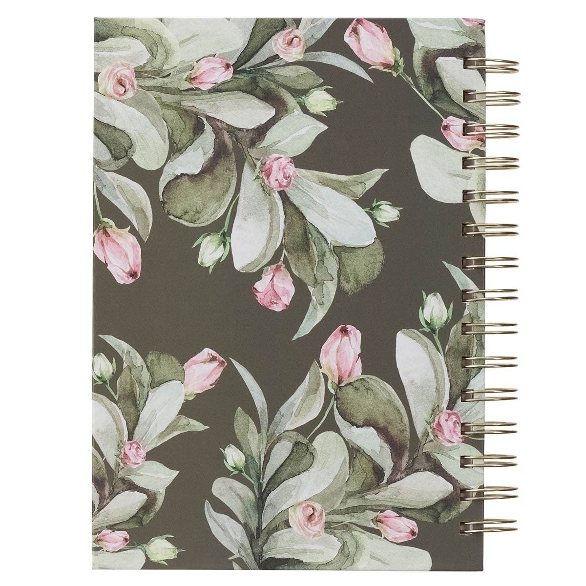 Pink rose with green leaf design against a green background, Gold-foiled accents, Gold-foiled lettering, He has made everything beautiful in its time, Ecclesiastes 3:11, Everything Beautiful Green Wreath Collection, Hardcover, Wirebound, Antique gold metal wire binding, 192 lined pages, Scripture on every page, Presentation page, Size: 8.4” x 6.4” x 1” (213 x 163 x 25 mm)