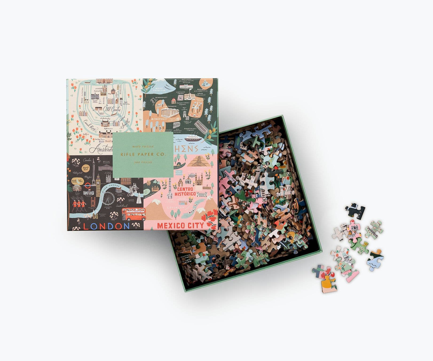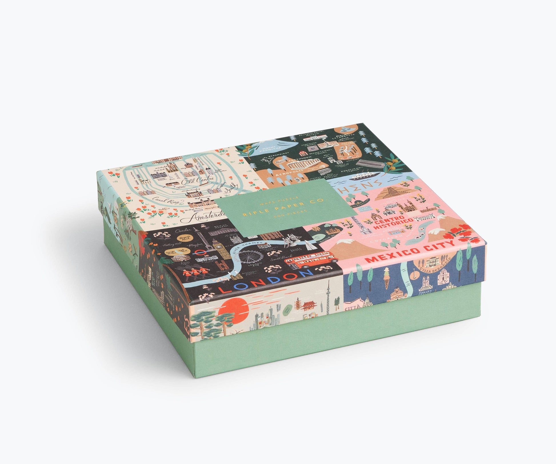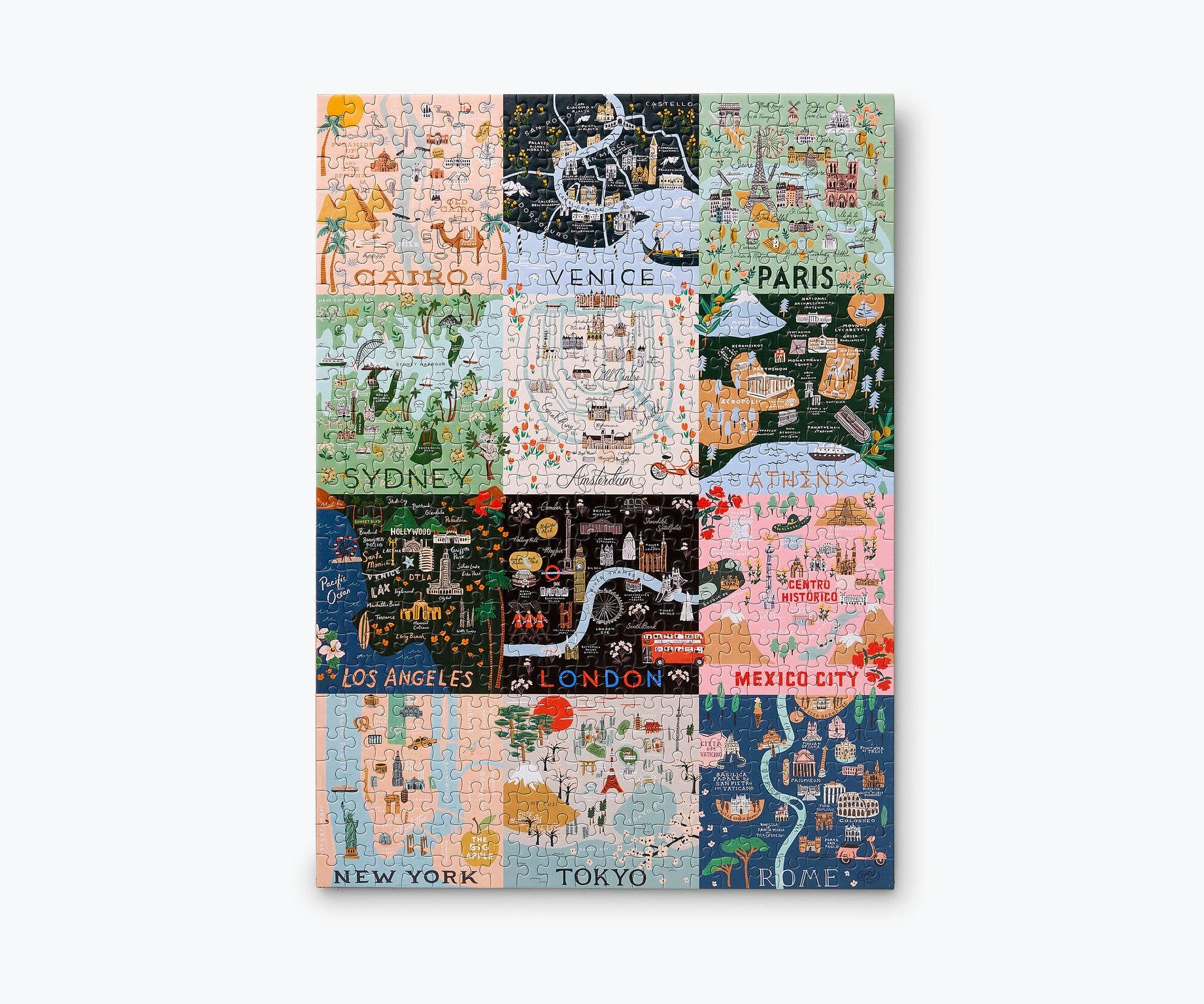 Description: Travel the world without leaving home with our City Maps jigsaw puzzle, featuring our favorite destinations from New York to Tokyo. Our illustrated puzzles include 500 pieces, packaged in a decorative box with gold foil accents.