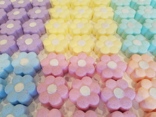 Mini Bath Bomb Daisies Mini Bath Bombs Make great birthday favors, wedding shower favors, Baby showers favors and more! Each order includes one daisy mini bath bomb. Choose from an assortment of pastel colors or pick your color. We infuse a blend of essential oils and all natural flavor oils into each batch of bath bombs. Bath bombs make bath time fun for everyone!