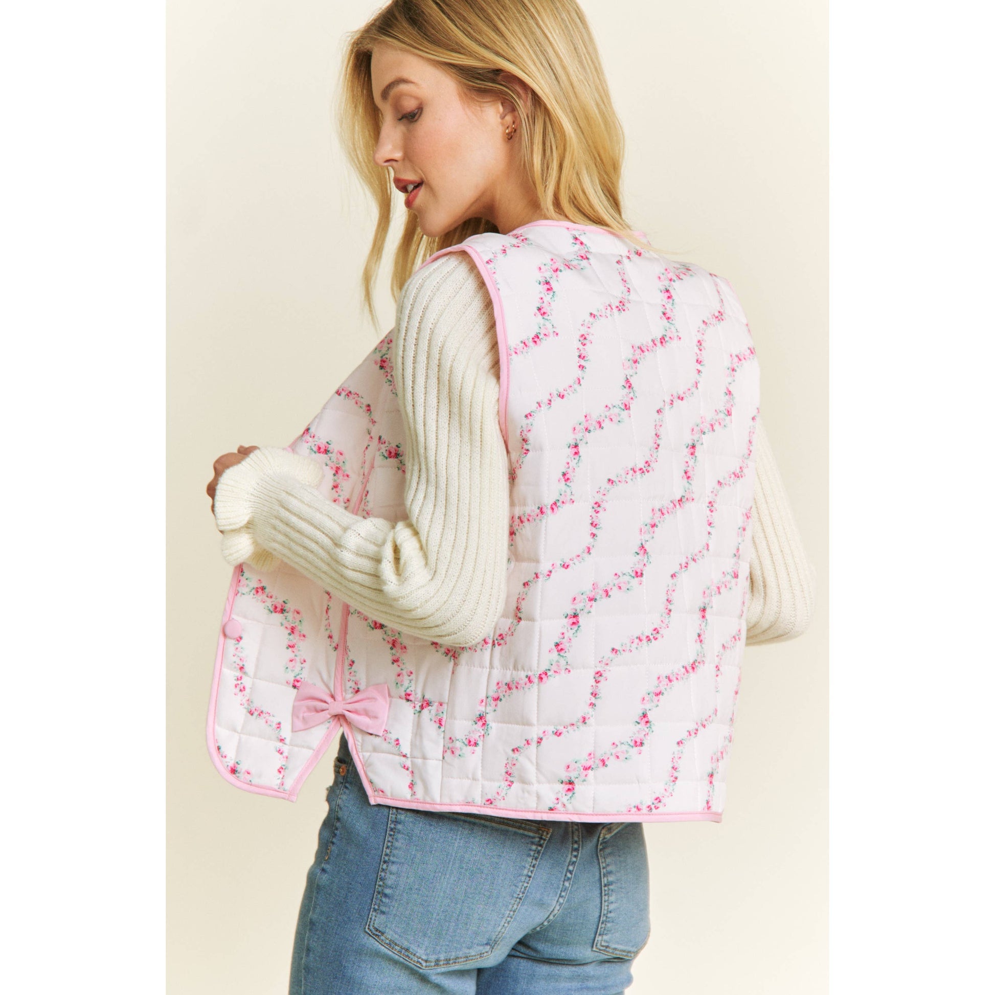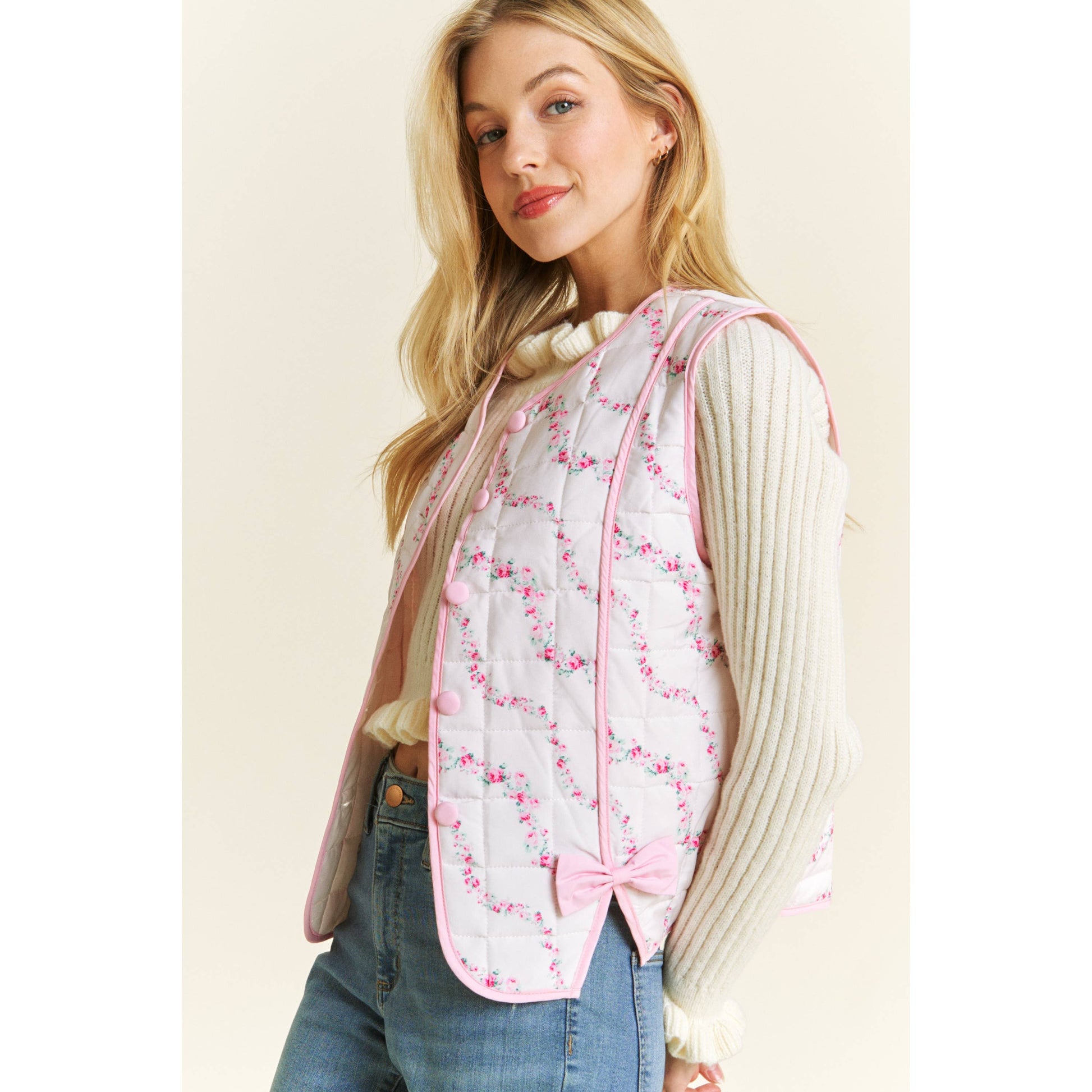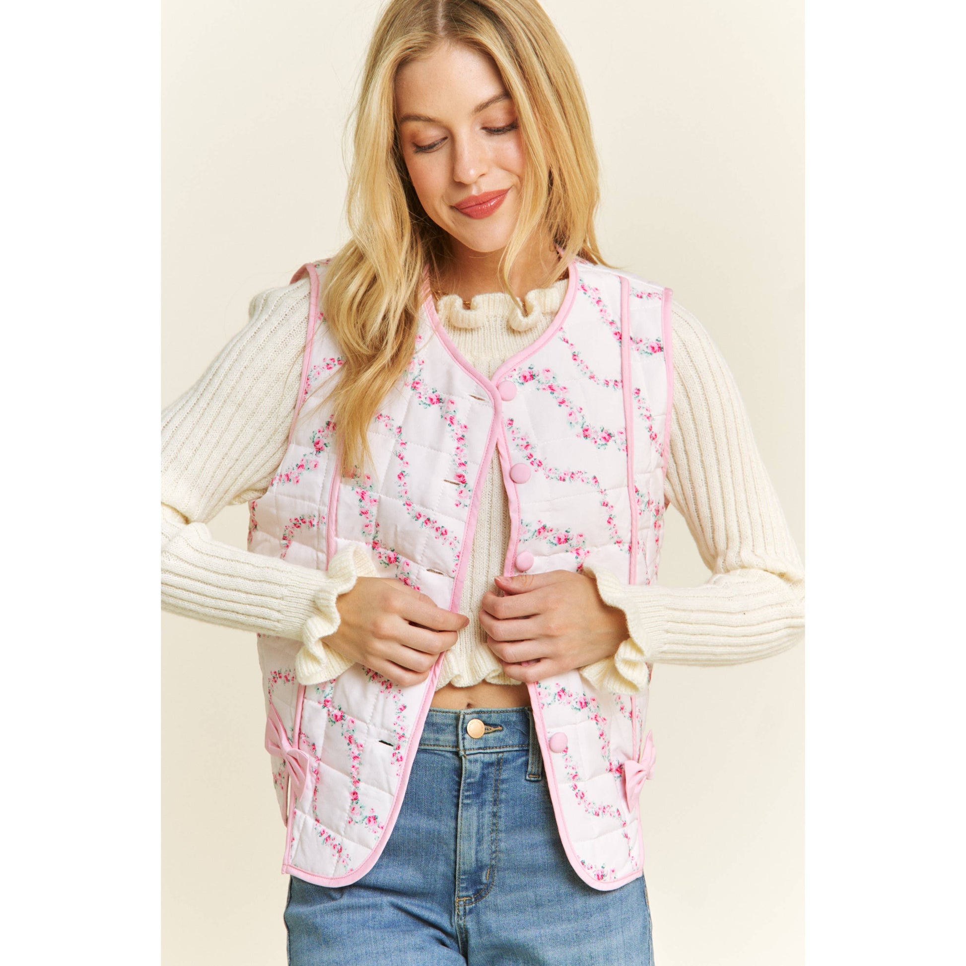 Classic round neck open front quilted vest jacket , colorful floral fabric used, contrast binding on the edges, button down.
