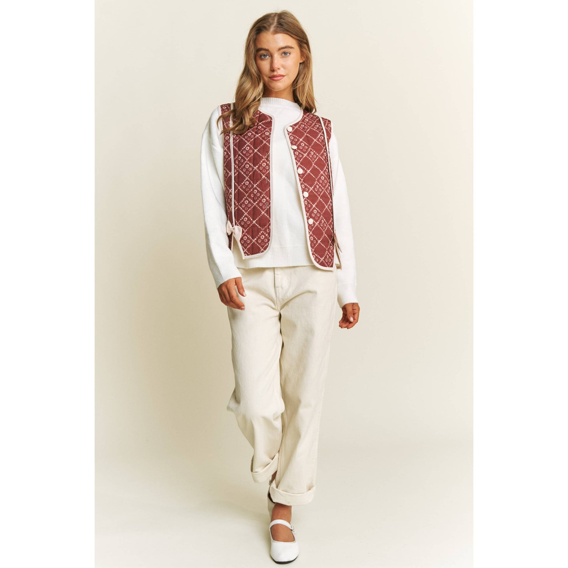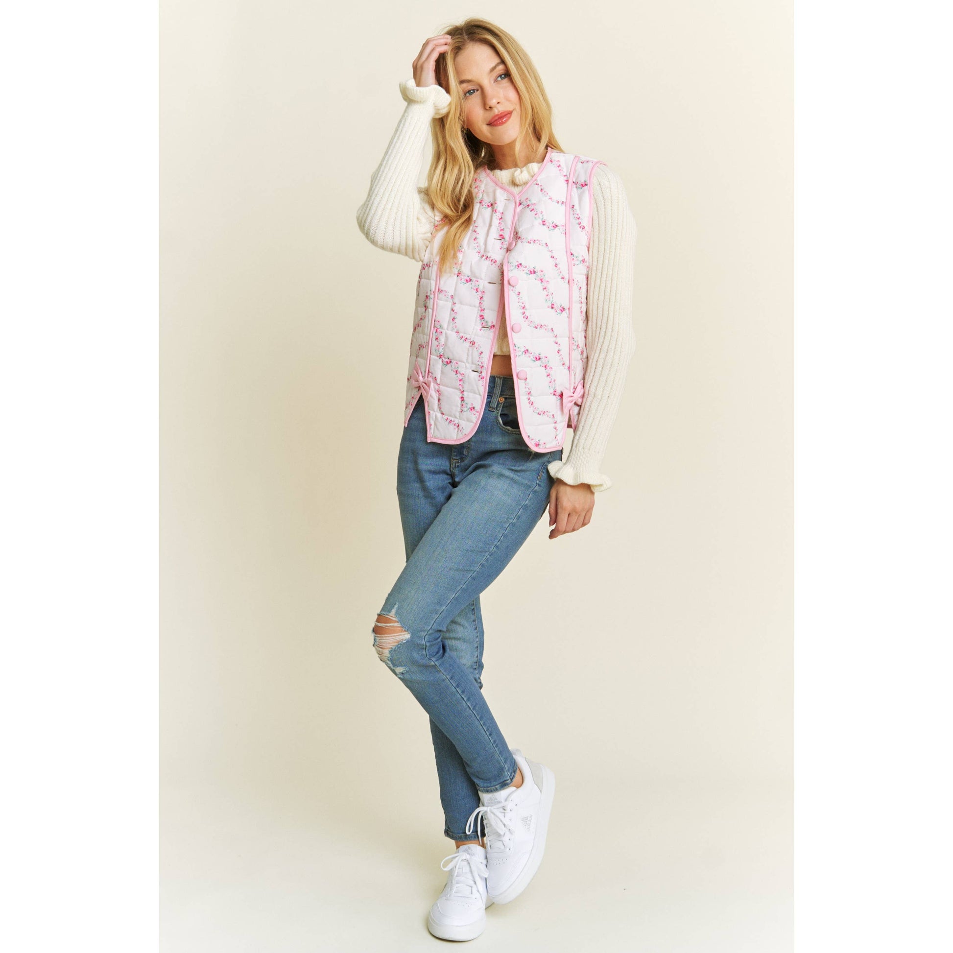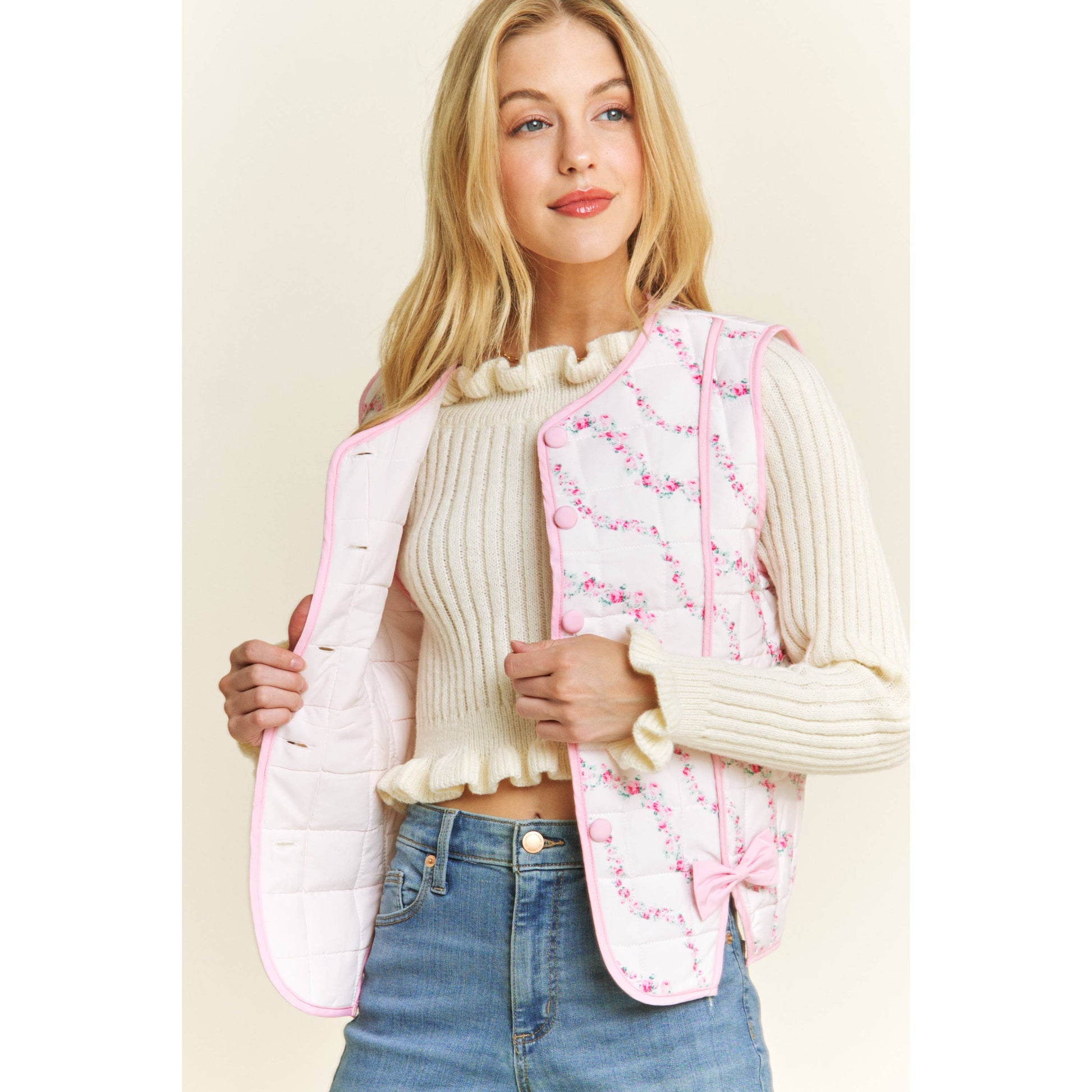 Classic round neck open front quilted vest jacket , colorful floral fabric used, contrast binding on the edges, button down.
