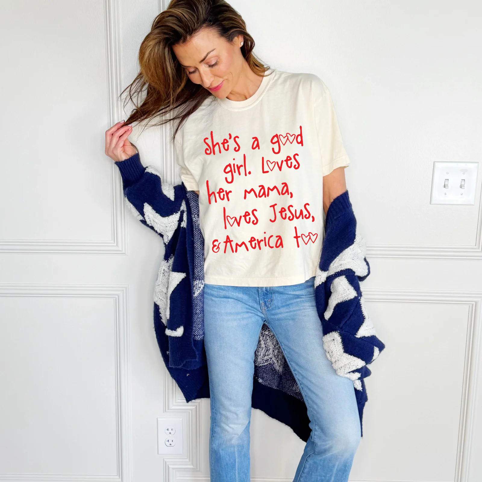 Celebrate your inner American girl with our She's a Good Girl Cropped Tee! This fun and playful cropped tee will make you feel patriotic and stylish. Perfect for any casual occasion, this tee is a must-have for any good girl. (Guaranteed to make you feel like a true American girl!)
