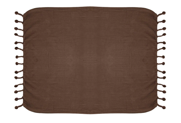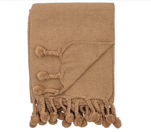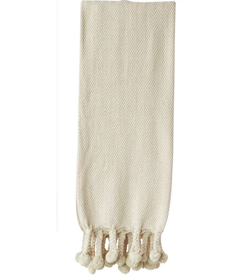 Cuddle up in this soft cotton throw. The fun pom-poms at the ends will look great when folded over the back or side of the couch. When folding, have both ends with pom-poms on the same side and make sure the top layer of pom-poms is folded shorter than the bottom showing them off in multiple layers.