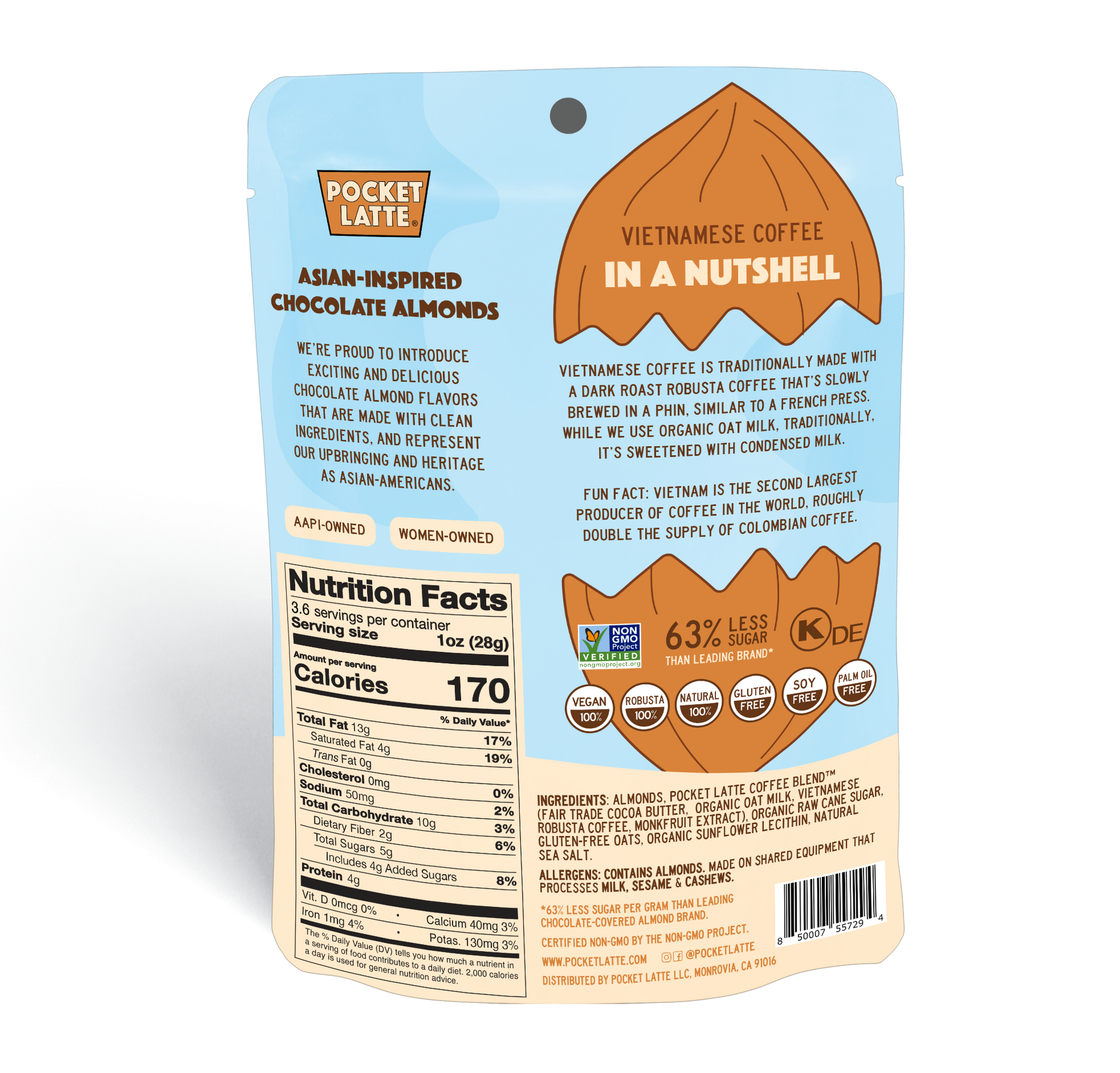 Choco Nuts are our new line chocolate-coated almonds, made with Pocket Latte® Signature Oat Milk Chocolate. These delicious snacks are low sugar, made with premium ingredients, and crafted with amazing flavors that represent our upbringing and heritage as Asian Americans.
